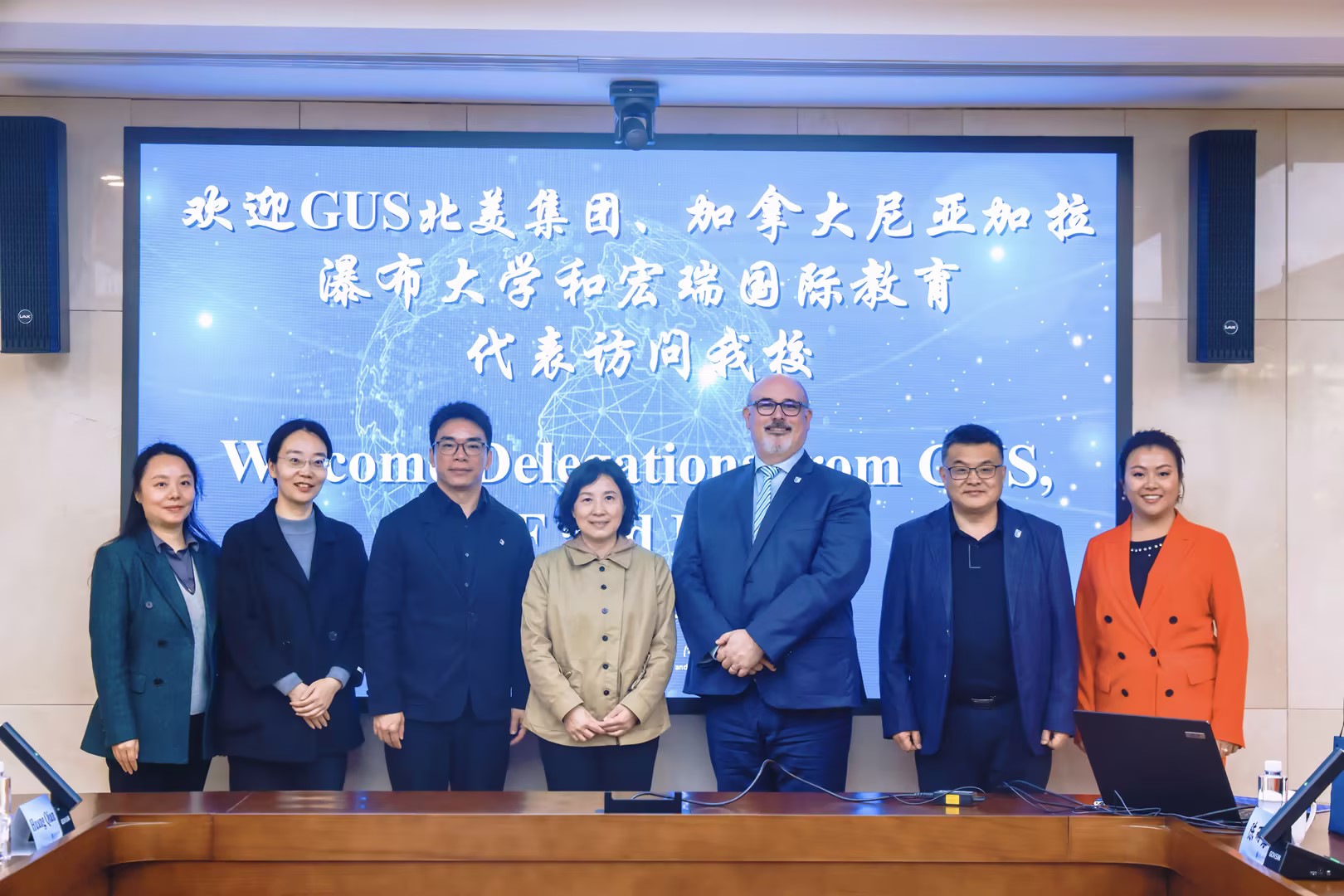 3月26日,加拿大尼亚加拉瀑布大学校长戴维.格雷(David Gray)、GUS北美集团项目与行政事务协调员米歇尔.黄(Michelle Huang)以及宏瑞国际教育总裁刘旭等代表来校访问交流。校长温涛、副校长柏群、国际合作与交流处与来宾交流会谈。